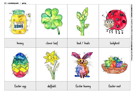 Liebevoll gezeichnete Wortschatzbilder zum Thema «Frühling» helfen den SchülerInnen, den Grundwortschatz spielerisch aufzubauen.