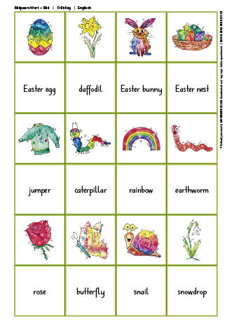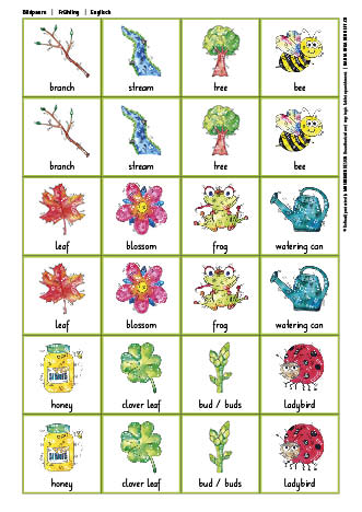 Liebevoll gezeichnete Wortschatzbilder zum Thema «Frühling» helfen den SchülerInnen, den Grundwortschatz spielerisch aufzubauen.